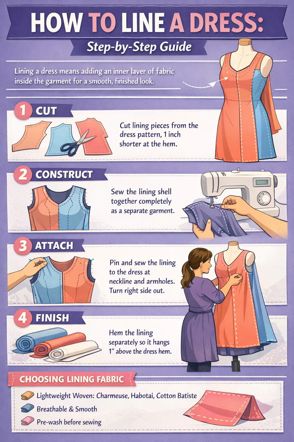 Forrar un vestido significa colocar una capa interior de tela, generalmente una tela liviana. tela tejida como poliéster charmeuse, habotai de seda o batista de algodón, hacia el interior de la capa exterior para que el vestido mantenga su forma, se sienta cómodo contra la piel y oculte los márgenes de costura interiores. El proceso implica cortar las piezas del forro de las mismas piezas del patrón que el vestido (con pequeños ajustes), coser el forro por separado y luego unirlo al vestido en el escote, las sisas o la abertura de la cremallera antes de darle la vuelta a toda la prenda.