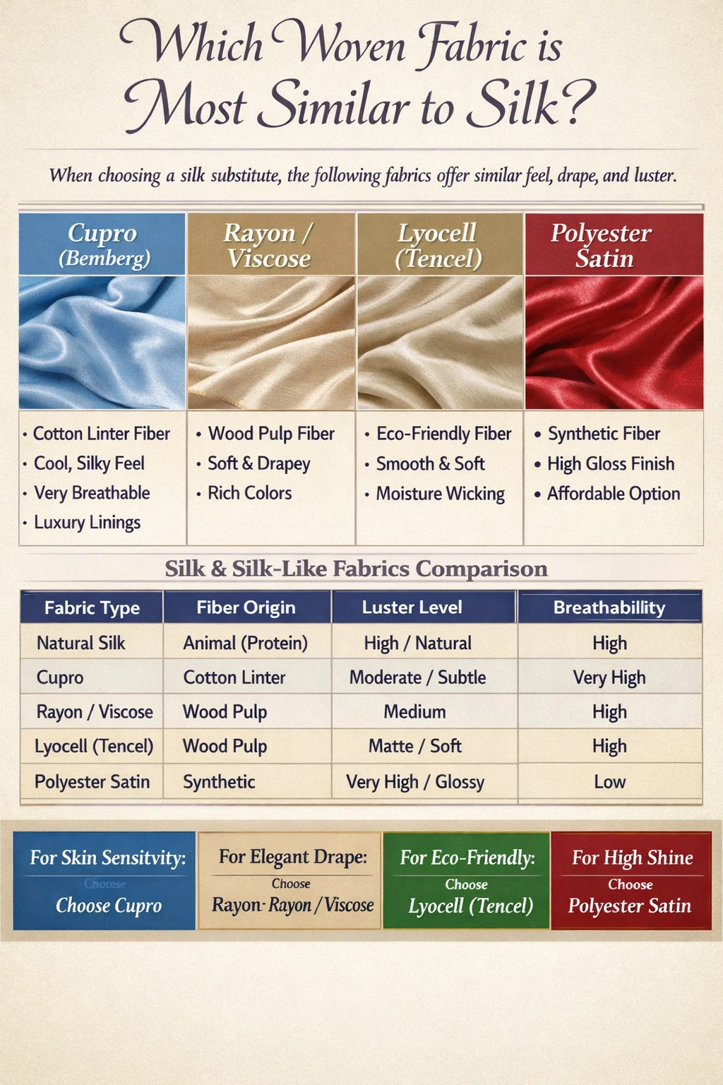 Al buscar un tela tejida que replica la sensación lujosa, el brillo y la caída de la seda natural, los contendientes más destacados son Rayón, Cupro y lyocell (Tencel) . Entre estos, Cupro es ampliamente considerado el rival más cercano en términos de transpirabilidad y tacto sedoso, mientras Poliéster tejido satinado Sirve como la alternativa sintética asequible más común. Estos tejidos utilizan específicos tejiendo Técnicas para imitar las fibras proteicas lisas producidas por los gusanos de seda.